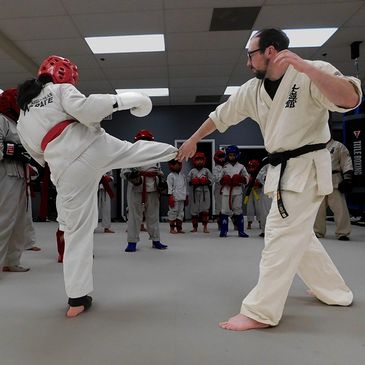 Our adult karate classes feature the Adult US Shidokan program, delivering the 'triathlon of martial arts'—a powerful combination of striking, grappling, and full-contact sparring. We emphasize sharpening your fundamentals while enhancing your physical and mental grit. You’ll master the three pillars of tradition: Kihon, where you nail the basic techniques; Kumite, where you put your skills to the test in controlled, full-contact sparring; and Kata, where you perfect choreographed forms to sharpen body control and honor traditional combat skills. Each session begins with a deep stretch to prime your muscles and wraps up with a high-energy cardio routine to keep you in peak condition. Ready to level up your martial arts journey?